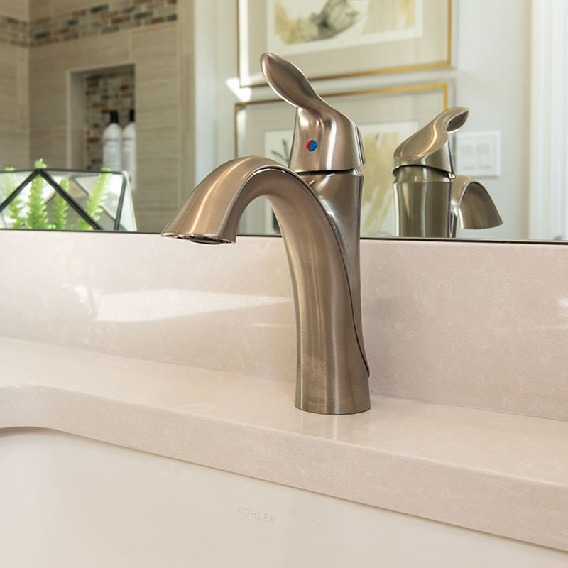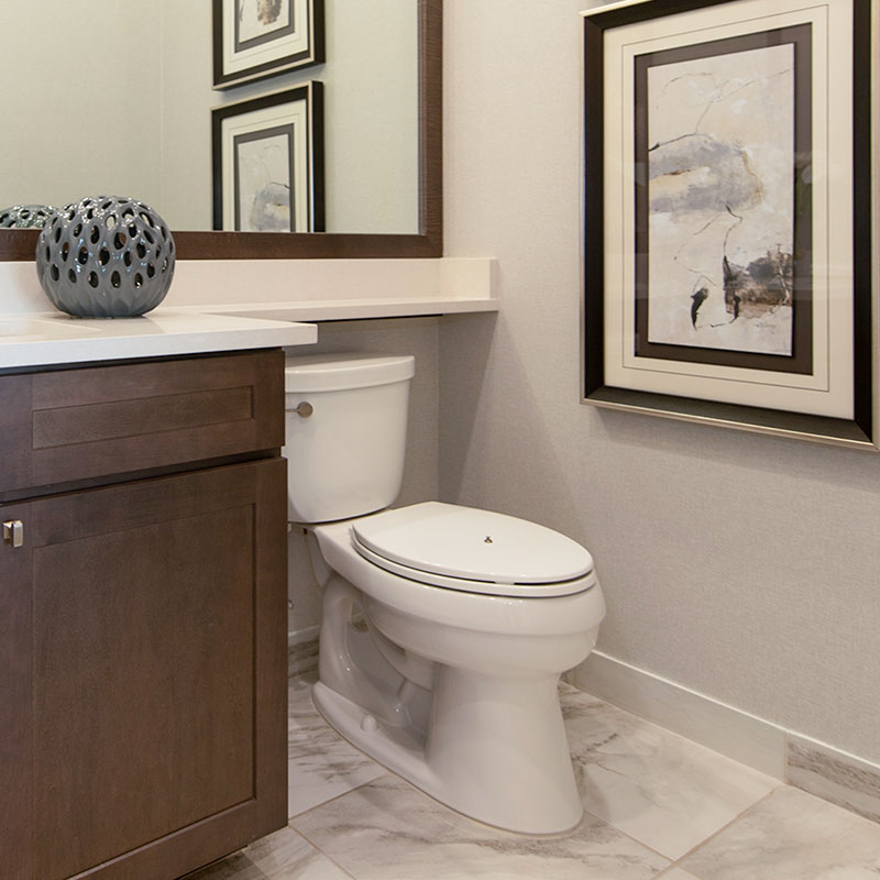 Bathroom designs and materials depicted may vary per plan and may not reflect the standard features provided or options available for your home. All solid surface materials will experience variations in color, shading, veining, marking, pattern and tone and imperfections such as surface pitting, spawling, fissures and blemishes. Color variations and inconsistency of wood grain patterns and finish may exist within and between the wood doors, drawer fronts and the other cabinet components. Actual colors and shades of colors of the tile may vary from the photographs and images of the tile samples and/or any installations in Seller’s design center and/or in any model homes. These photographs and images may not depict the extent of such inherent characteristics. In addition, the photographs may be pictures of sample products and may not be quality depictions of the actual products based on lighting, reflections, image quality and display variations. Please refer to the Color Selection Acknowledgment and Product Disclaimer in your Purchase Contract for additional details. All selections are subject to availability, change or substitution.